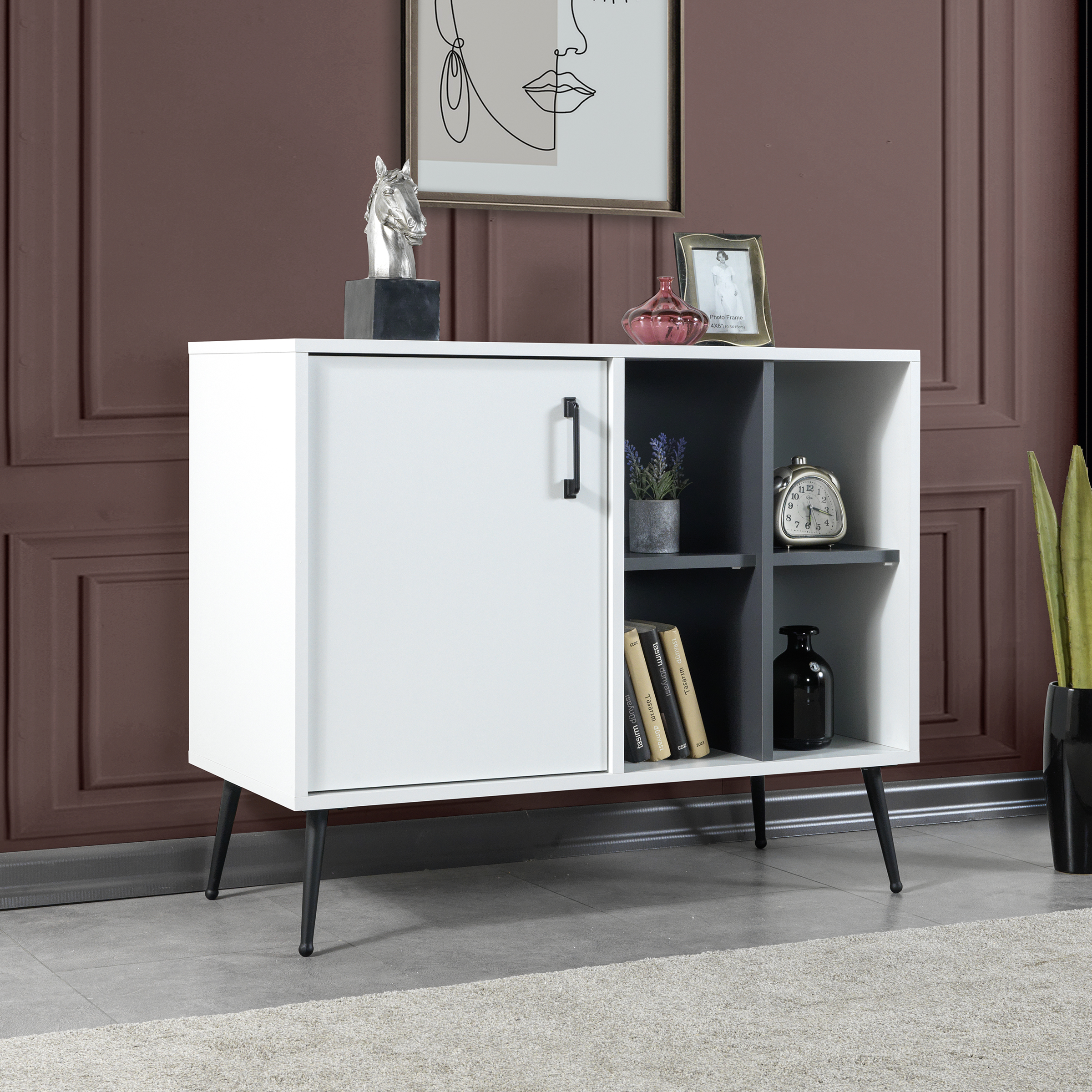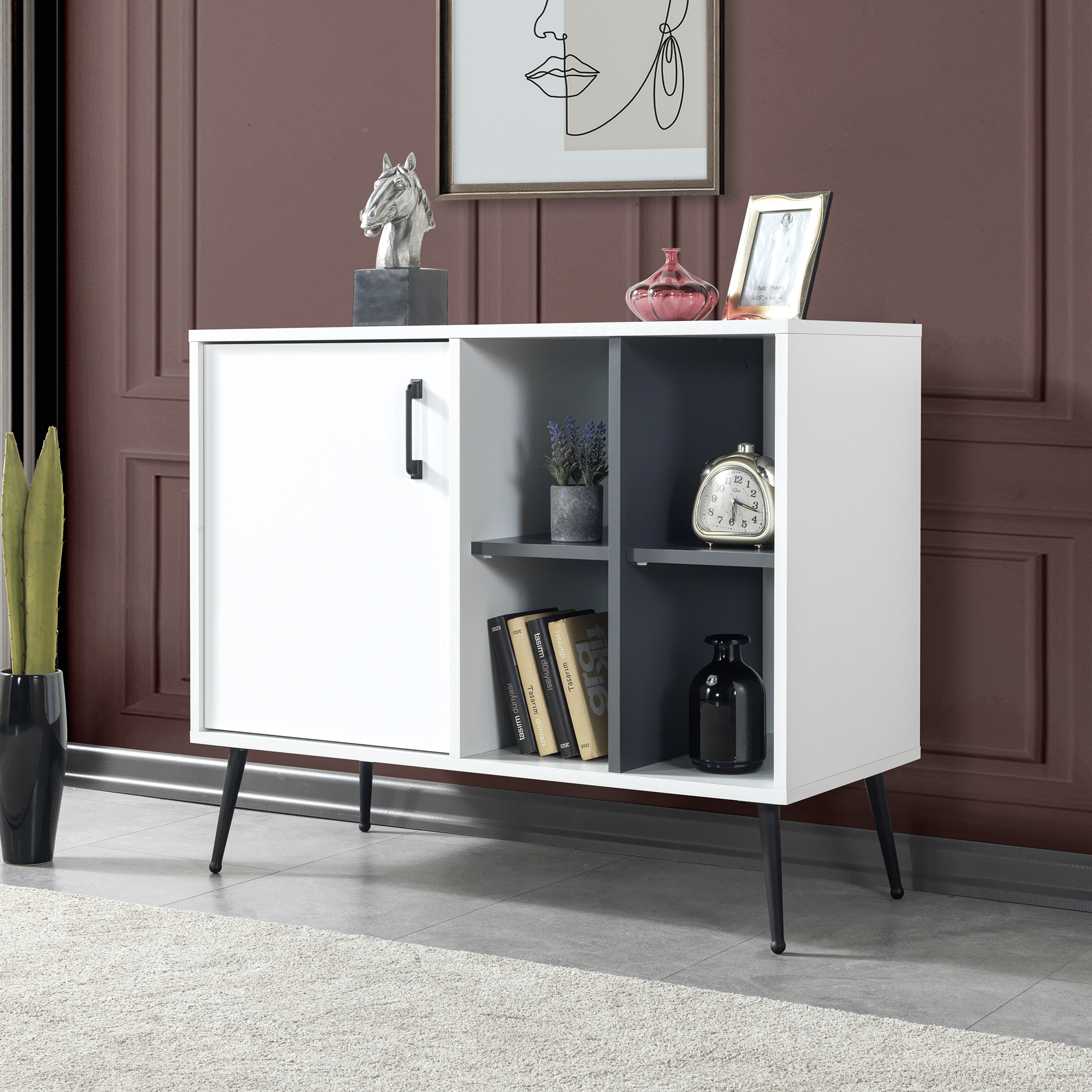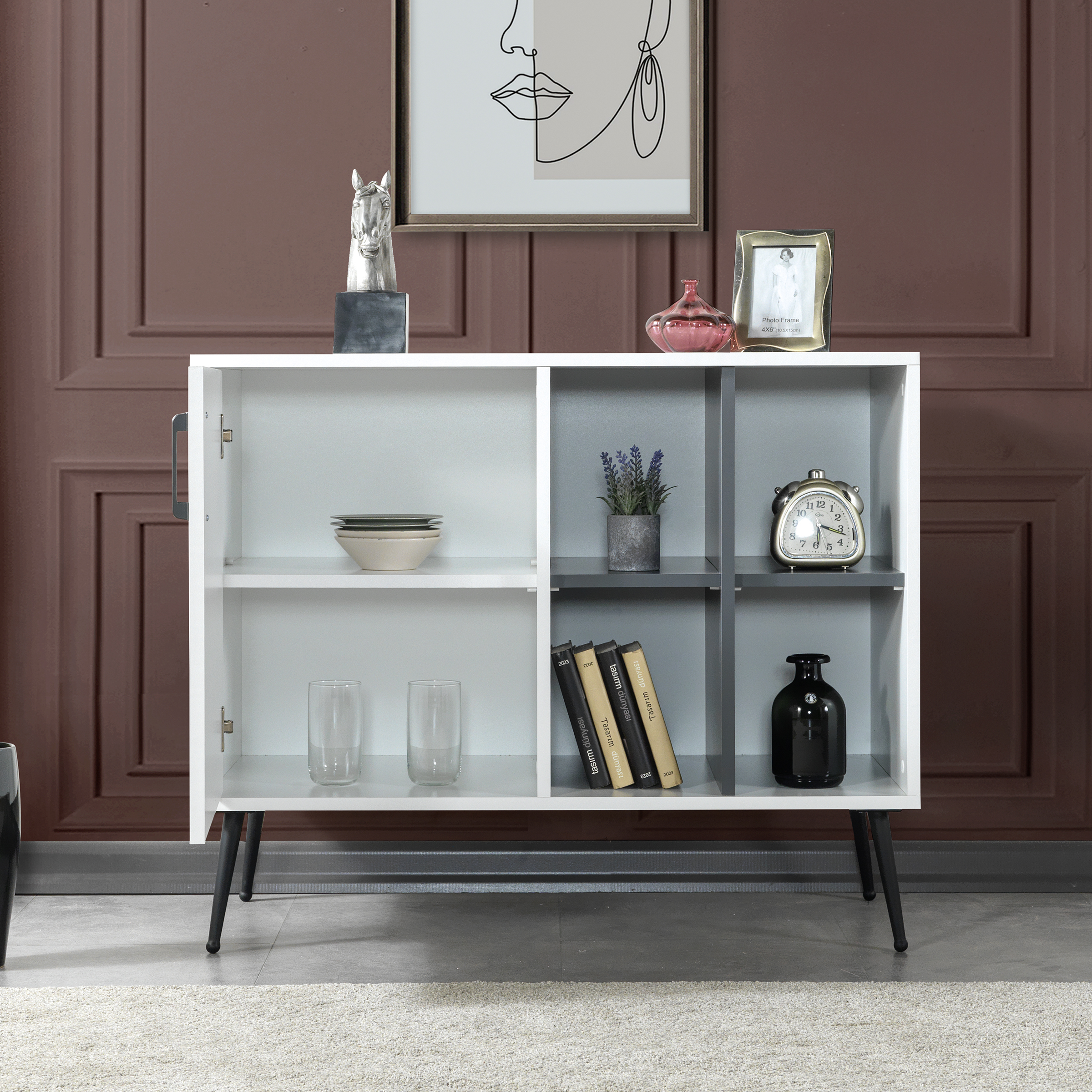 • Fonksiyonel Depolama:İç hacmi, kişisel eşyalarınızı, servis takımlarınızı ya da dekoratif objelerinizi rahatlıkla yerleştirebileceğiniz geniş bir alan sunar.