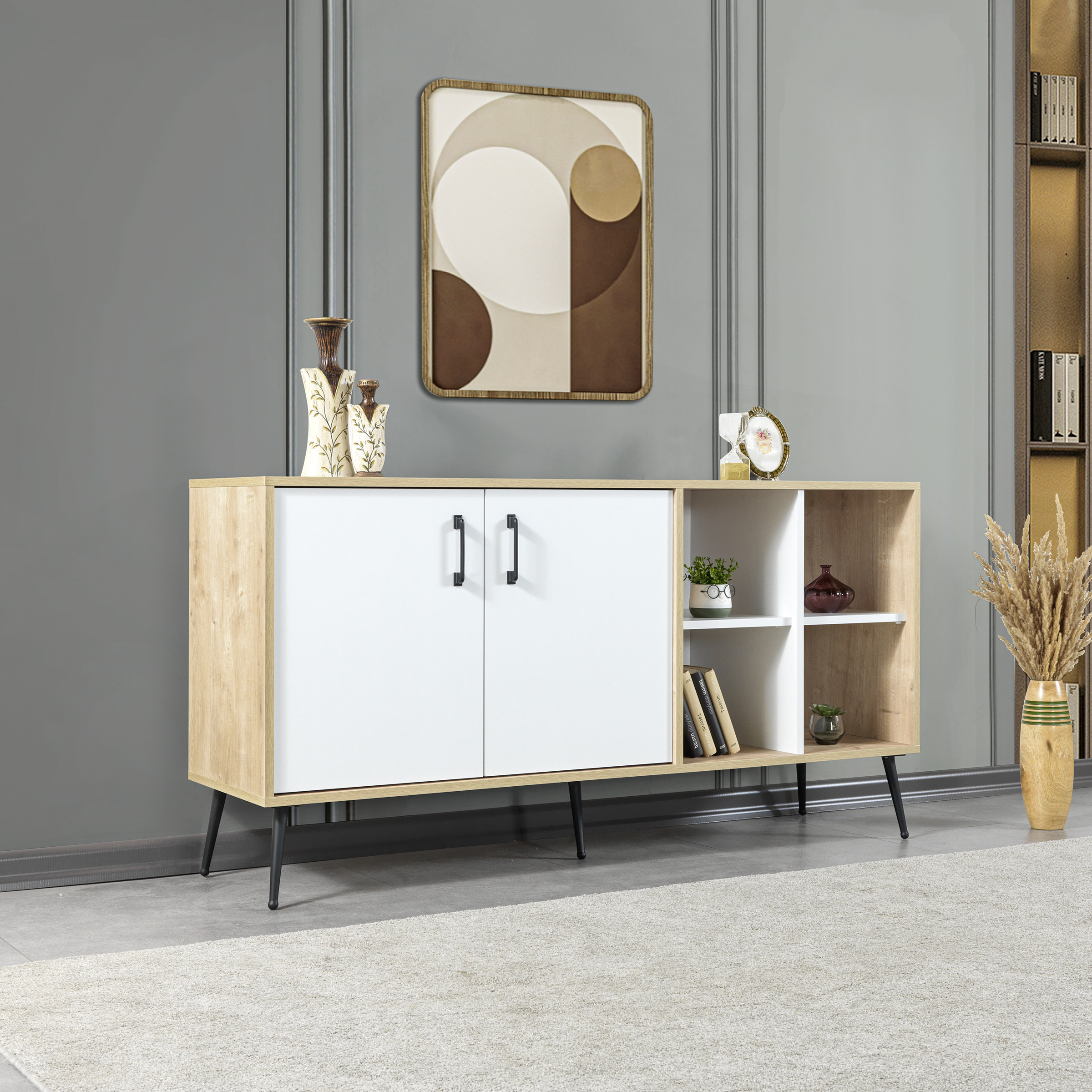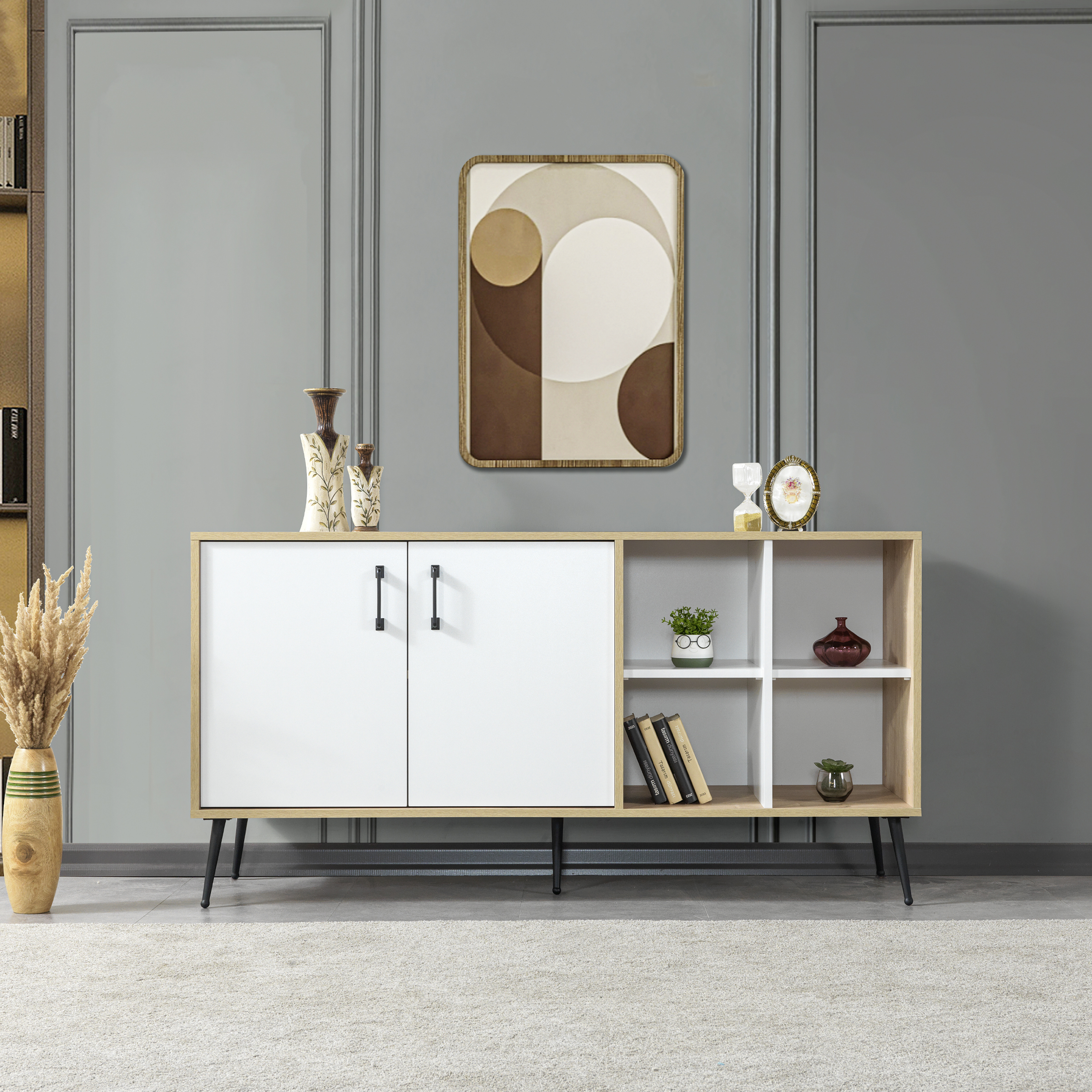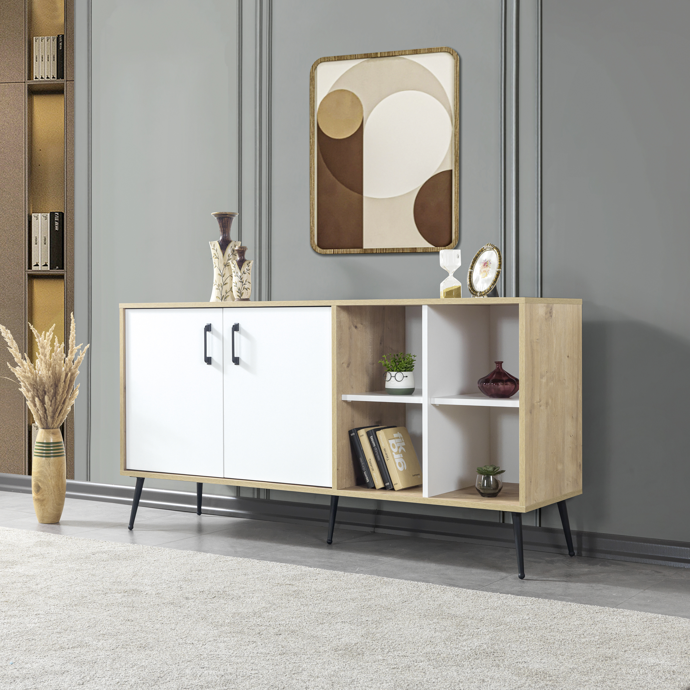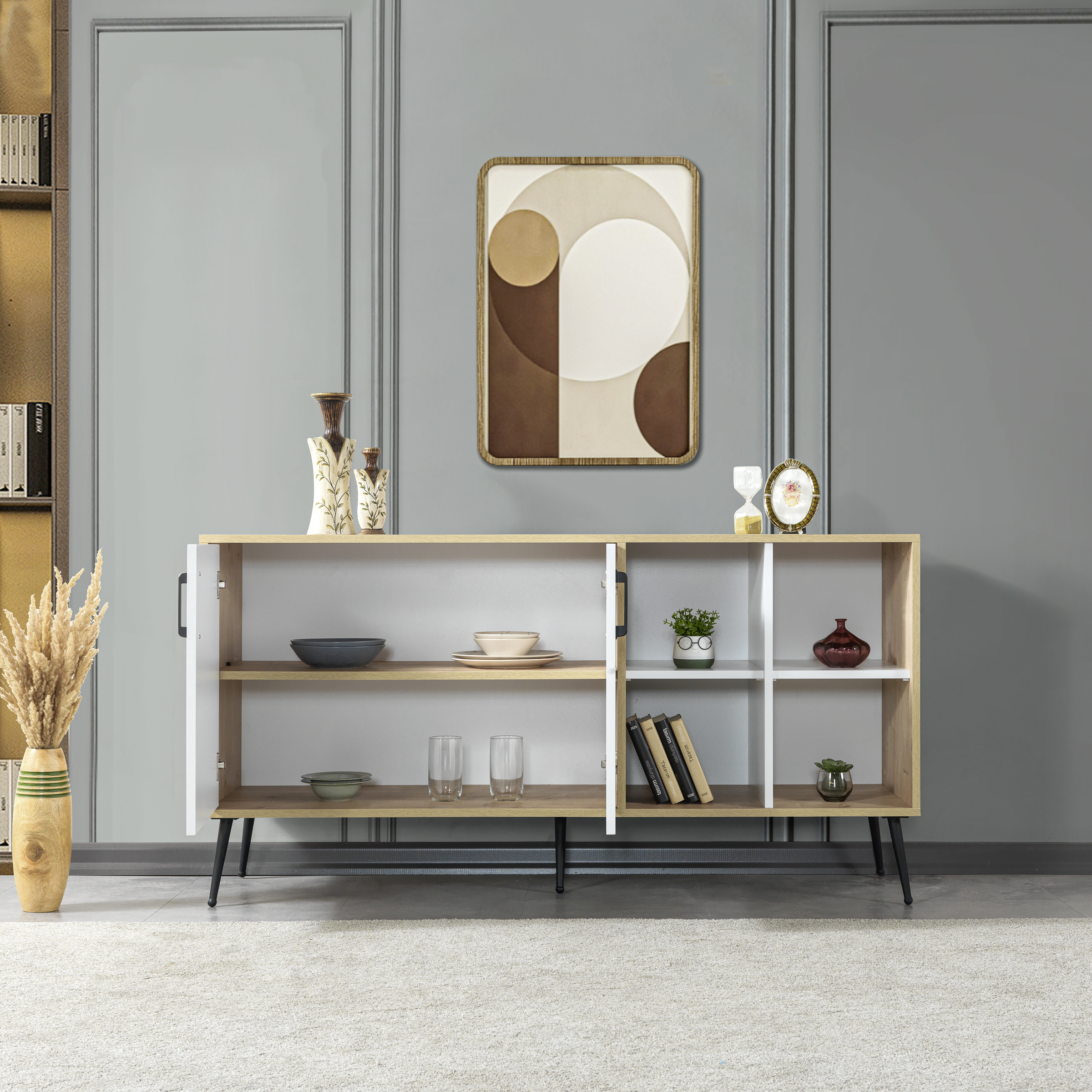 • Fonksiyonel Depolama:İç hacmi, kişisel eşyalarınızı, servis takımlarınızı ya da dekoratif objelerinizi rahatlıkla yerleştirebileceğiniz geniş bir alan sunar.