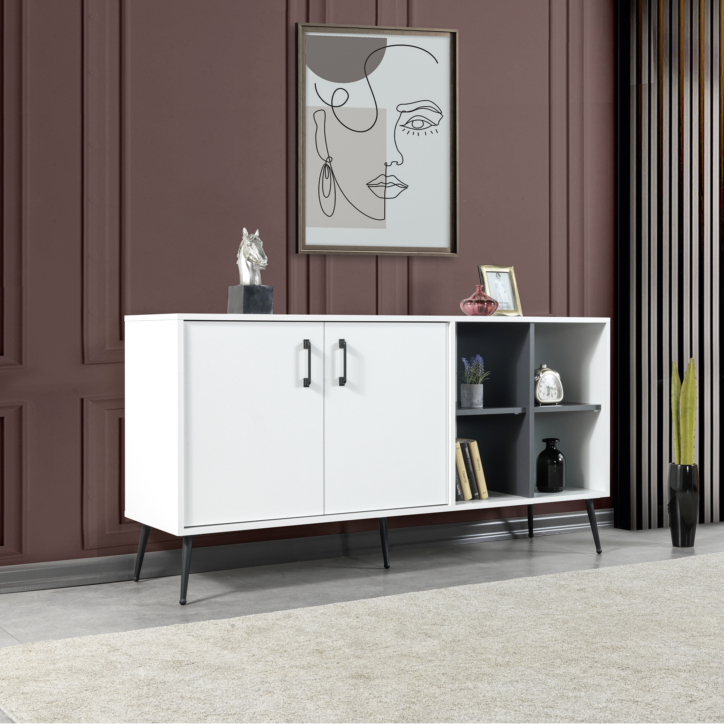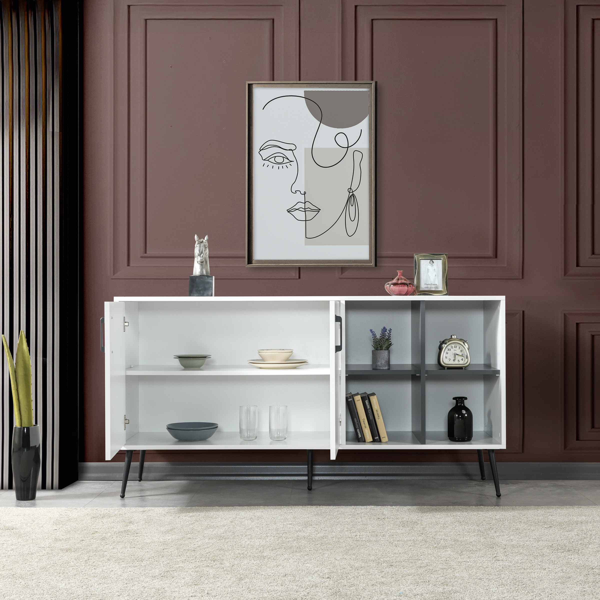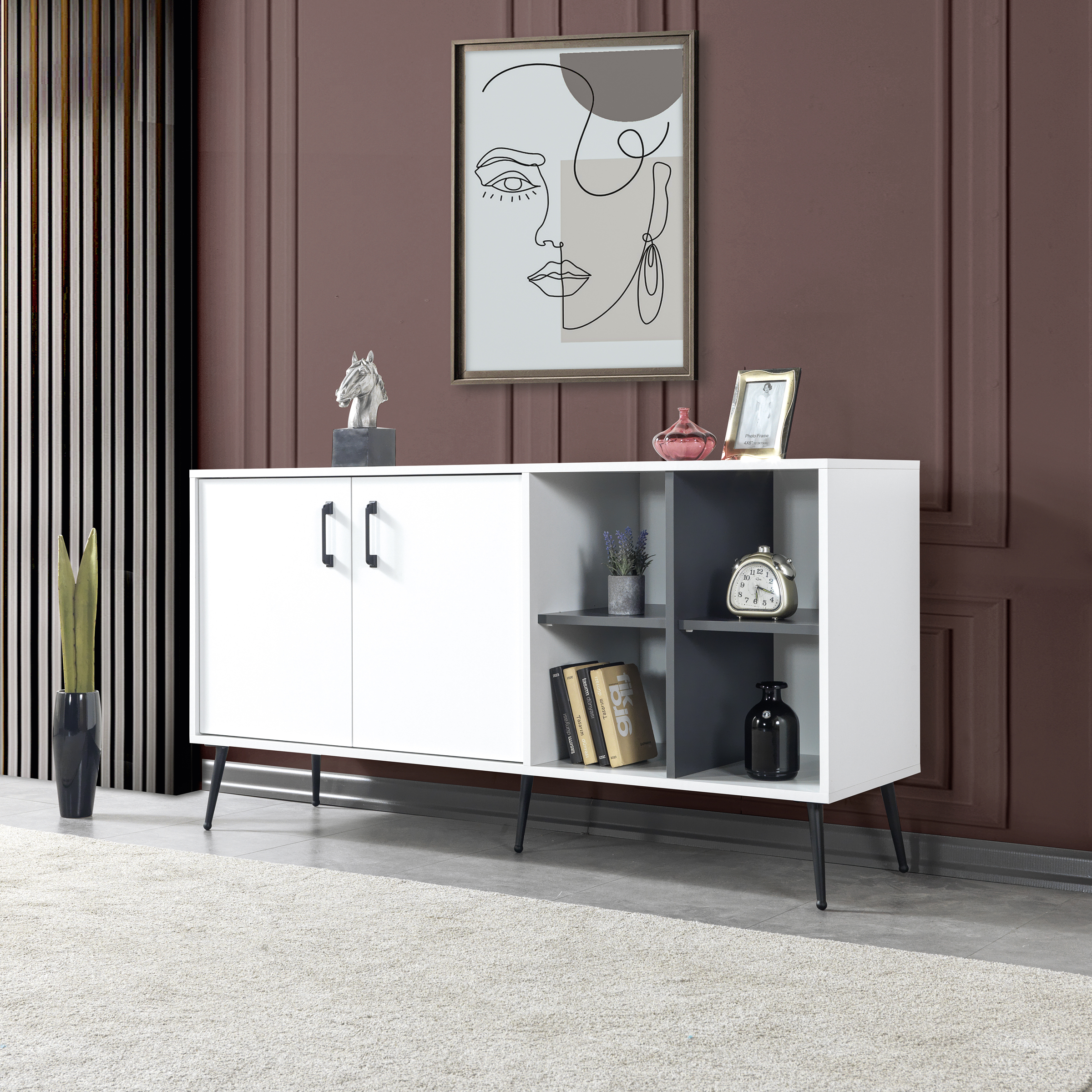 • Fonksiyonel Depolama:İç hacmi, kişisel eşyalarınızı, servis takımlarınızı ya da dekoratif objelerinizi rahatlıkla yerleştirebileceğiniz geniş bir alan sunar.