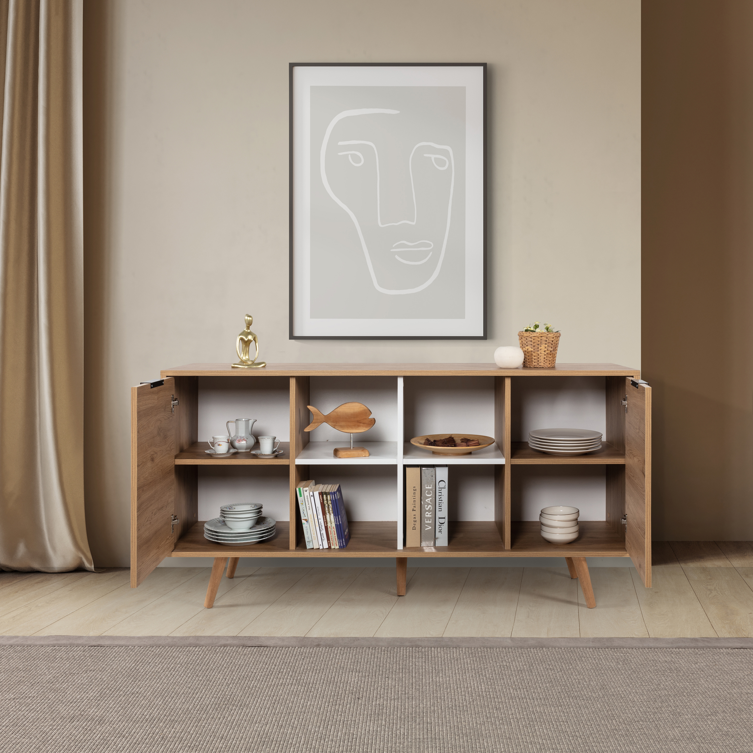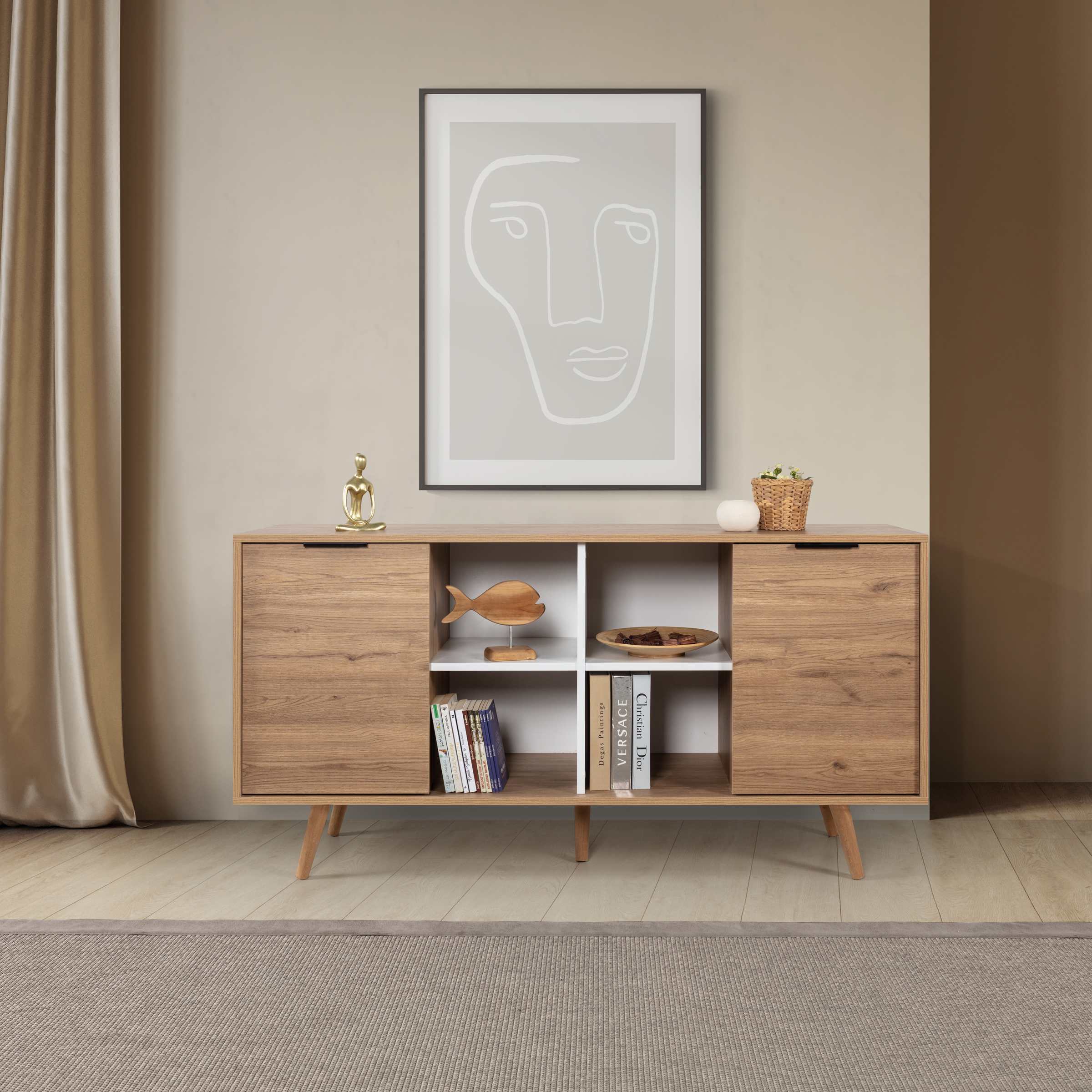 Evinizin dekorasyonuna modern bir dokunuş katmak istiyorsanız, ahşap ayaklı metal kulplu konsol tam size göre! Şık tasarımı, geniş depolama alanı ve dayanıklı yapısıyla hem estetik hem de işlevsel bir kullanım sunar. Salon, oturma odası veya antre gibi yaşam alanlarında mükemmel bir tamamlayıcı olarak öne çıkar.