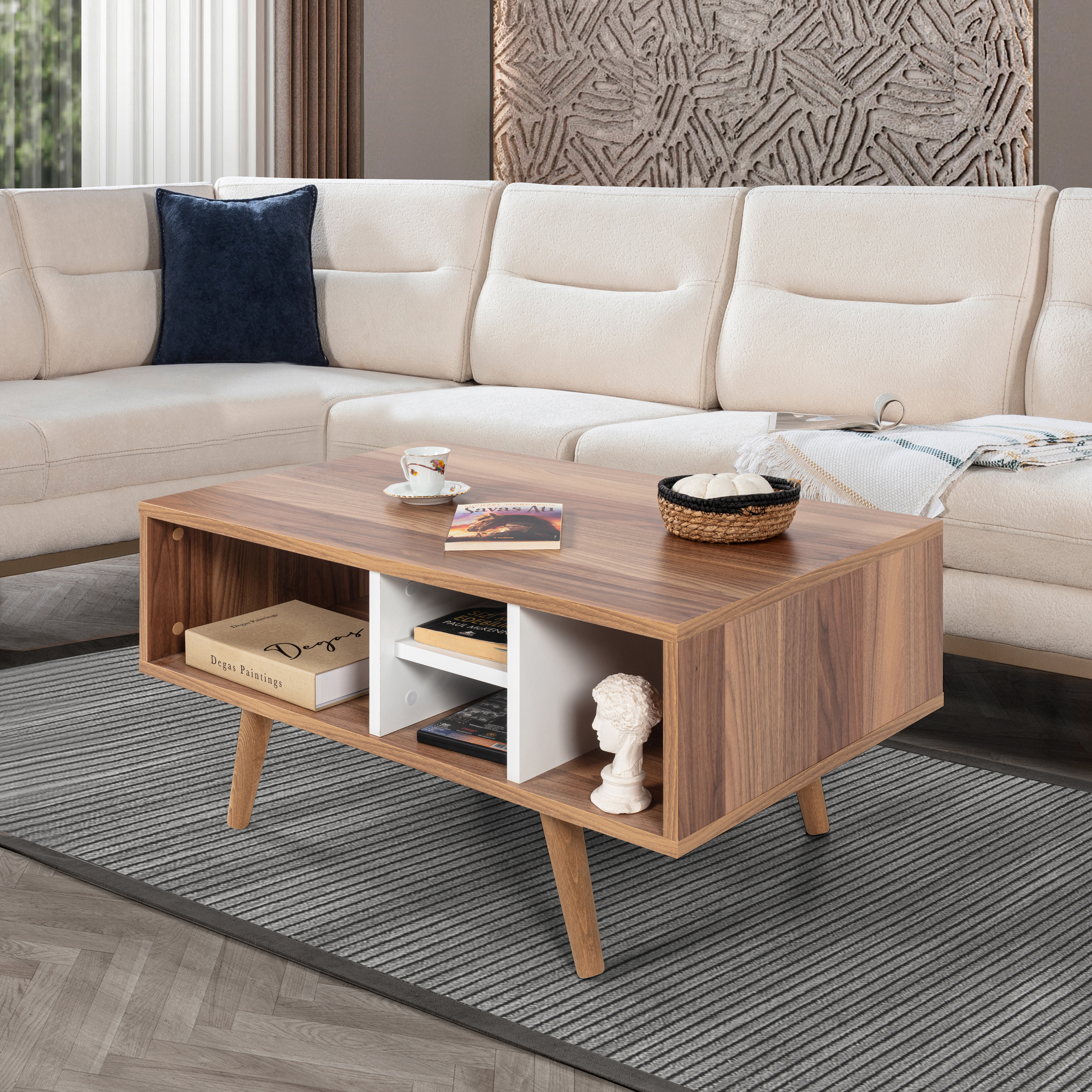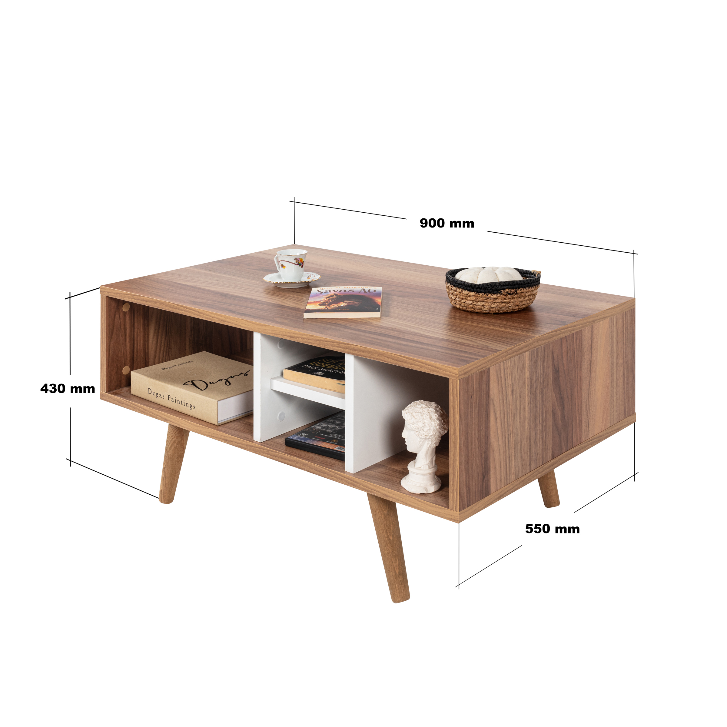 Modern Tasarımlı Ahşap Ayaklı Orta Sehpa – Şık ve Dayanıklı Evinizin en göz alıcı tamamlayıcısı olmaya aday bu modern orta sehpa, fonksiyonelliği ve estetiği bir araya getiriyor.; Ahşap ayakları sayesinde doğal ve sıcak bir görünüm sunarken, bölmeleri ve geniş raf alanı ile günlük kullanımda maksimum depolama ve düzen kolaylığı sağlar.; Ölçüler: Genişlik: 90 cm Derinlik: 55 cm Yükseklik: 43 cm Öne Çıkan Özellikler: Ahşap Ayaklı Tasarım: Doğal dokulu sağlam ahşap ayakları modern görünümü güçlendirir ve dayanıklılık sağlar.; Modern ve Şık Tasarım: Minimal çizgileriyle her dekorasyon stiline uyum sağlar.; Dayanıklı Yapı: Kaliteli malzemesi ve sağlam ahşap ayakları sayesinde uzun yıllar güvenle kullanılabilir.; Fonksiyonel Kullanım: Pratik bölmeleri ve geniş raf alanı; kitap, dergi, kumanda, dekor ürünleri gibi eşyalarınızı düzenli bir şekilde konumlandırmanızı sağlar.; Çok Yönlü Kullanım: Salon, oturma odası veya ofis ortamlarında estetik ve işlevsel bir tamamlayıcı mobilya olarak ideal.; Modern yaşam alanlarına hem stil hem de düzen katacak bu orta sehpa, kullanım kolaylığı ve dekoratif görünümüyle vazgeçilmez parçanız olacak.; Uluslararası Standartlarda Paketleme: Hasarsız ve sorunsuz bir teslimat süreci için ürünlerimiz en doğru yöntemlerle paketlenerek sizlere teslim edilmektedir.; Fabrikamızda demonte olarak hazırlanan ürünlerimizin paketlenmesinde, ürünleri korumak için yan yüzeylerde 18 mm kalınlıkta kesilen, Petek Panel adı verilen karton malzeme kullanılmaktadır.; Ürün köşelerinin deforme olmasını engellemek amacıyla, 2 cm kalınlığında köpük ve 4mm kalınlığında mukavva köşe koruyucu kullanılarak paketleme yapılmaktadır.; Dış koli ambalajında ise 5 katmanlı oluklu mukavva kullanılmaktadır.; Böylece en hassas ürünler bile güvenli şekilde taşınabilmektedir.; Tüm kartonlar %100 geri dönüşüm özelliğine sahiptir.; Kurulum Bilgisi: Ürünlerimiz demonte olarak gönderilmektedir ve kurulum müşteriye aittir.; Paketin içerisinden çıkan kurulum şablonu ile ürününüzü keyifle kullanıma hazırlayabilirsiniz.; Daha kolay bir kurulum için tüm parçalar üzerinde bulunan numaralar sayesinde, bağlantı aksesuarlarının yerini kolayca bulabilirsiniz.; Ürünün kurulumu için tornavida ve çekiç yeterlidir.; Bağlantı sistemi olarak minifiks, kavela tercih edilmektedir.; Böylece ürün zarar görmeden, defalarca kolaylıkla sökülüp kurulabilir.
