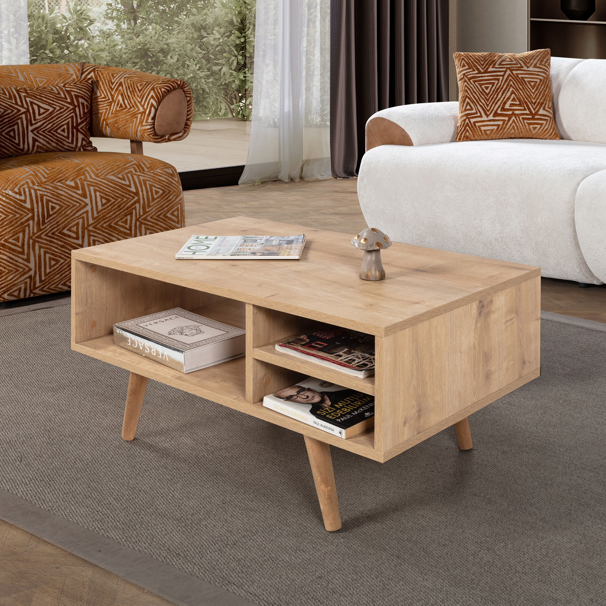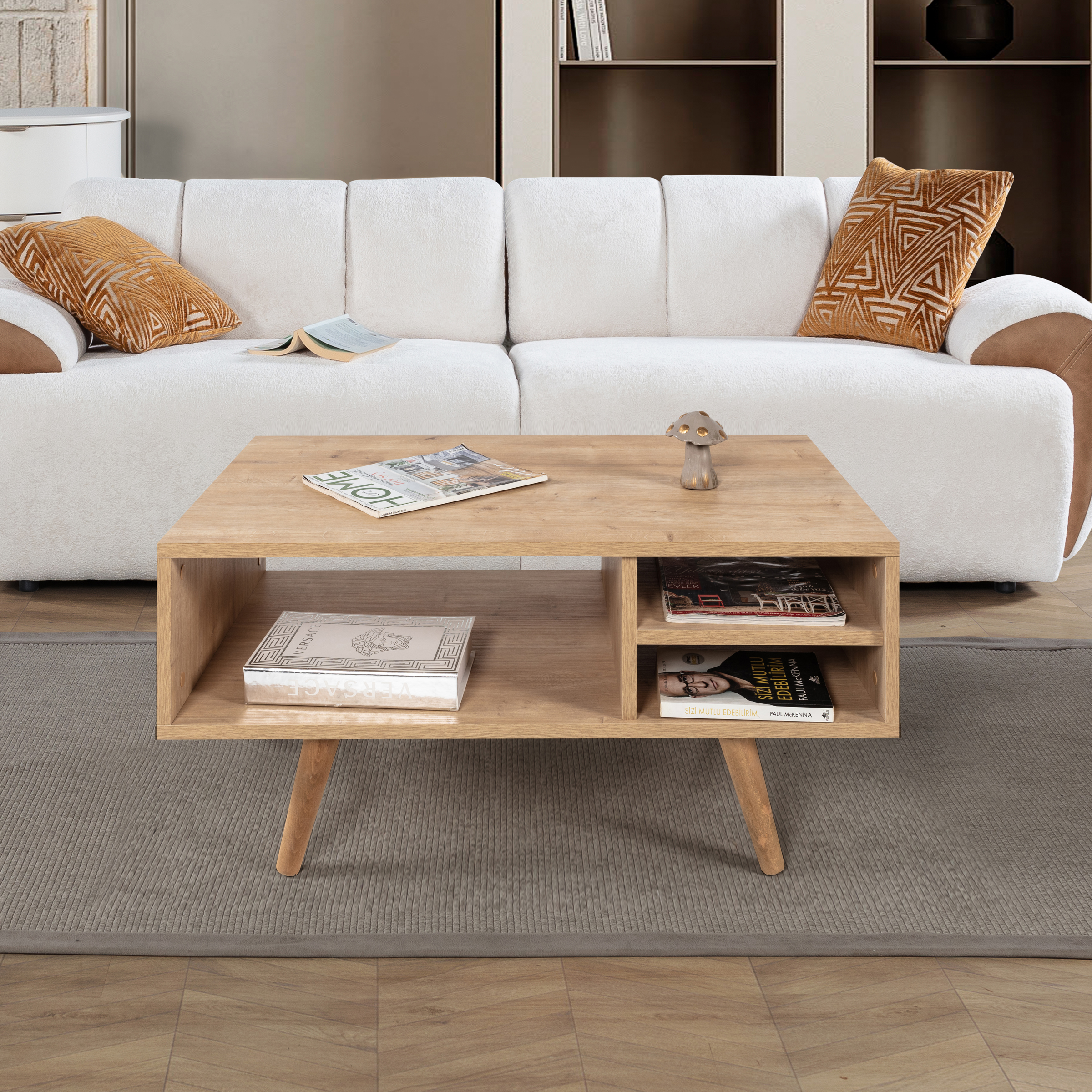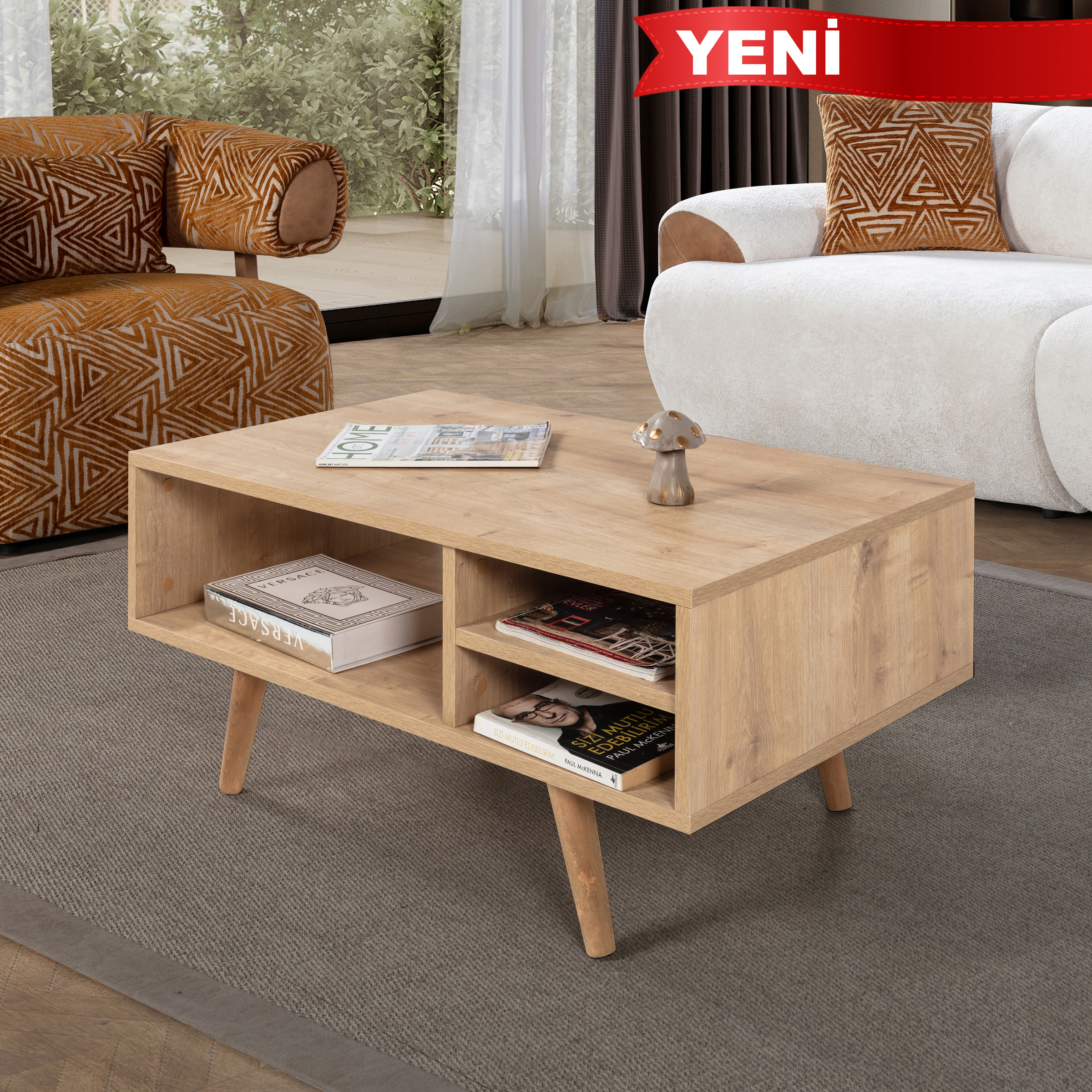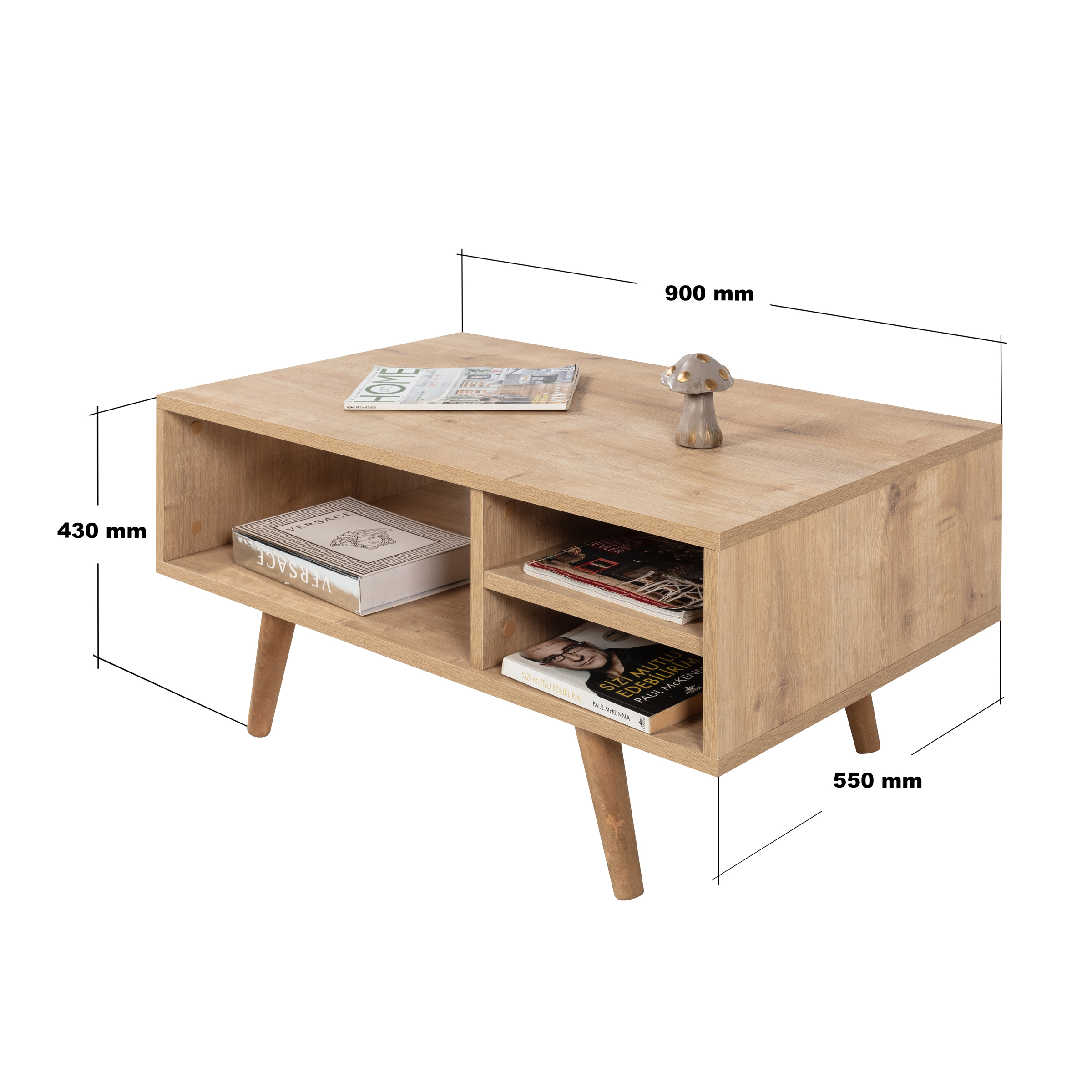 Modern Tasarımlı Ahşap Ayaklı Orta Sehpa – Şık ve Dayanıklı Evinizin en göz alıcı tamamlayıcısı olmaya aday bu modern orta sehpa, fonksiyonelliği ve estetiği bir araya getiriyor.; Ahşap ayakları sayesinde doğal ve sıcak bir görünüm sunarken, bölmeleri ve geniş raf alanı ile günlük kullanımda maksimum depolama ve düzen kolaylığı sağlar.; Ölçüler: Genişlik: 90 cm Derinlik: 55 cm Yükseklik: 43 cm Öne Çıkan Özellikler: Ahşap Ayaklı Tasarım: Doğal dokulu sağlam ahşap ayakları modern görünümü güçlendirir ve dayanıklılık sağlar.; Modern ve Şık Tasarım: Minimal çizgileriyle her dekorasyon stiline uyum sağlar.; Dayanıklı Yapı: Kaliteli malzemesi ve sağlam ahşap ayakları sayesinde uzun yıllar güvenle kullanılabilir.; Fonksiyonel Kullanım: Pratik bölmeleri ve geniş raf alanı; kitap, dergi, kumanda, dekor ürünleri gibi eşyalarınızı düzenli bir şekilde konumlandırmanızı sağlar.; Çok Yönlü Kullanım: Salon, oturma odası veya ofis ortamlarında estetik ve işlevsel bir tamamlayıcı mobilya olarak ideal.; Modern yaşam alanlarına hem stil hem de düzen katacak bu orta sehpa, kullanım kolaylığı ve dekoratif görünümüyle vazgeçilmez parçanız olacak.; Uluslararası Standartlarda Paketleme: Hasarsız ve sorunsuz bir teslimat süreci için ürünlerimiz en doğru yöntemlerle paketlenerek sizlere teslim edilmektedir.; Fabrikamızda demonte olarak hazırlanan ürünlerimizin paketlenmesinde, ürünleri korumak için yan yüzeylerde 18 mm kalınlıkta kesilen, Petek Panel adı verilen karton malzeme kullanılmaktadır.; Ürün köşelerinin deforme olmasını engellemek amacıyla, 2 cm kalınlığında köpük ve 4mm kalınlığında mukavva köşe koruyucu kullanılarak paketleme yapılmaktadır.; Dış koli ambalajında ise 5 katmanlı oluklu mukavva kullanılmaktadır.; Böylece en hassas ürünler bile güvenli şekilde taşınabilmektedir.; Tüm kartonlar %100 geri dönüşüm özelliğine sahiptir.; Kurulum Bilgisi: Ürünlerimiz demonte olarak gönderilmektedir ve kurulum müşteriye aittir.; Paketin içerisinden çıkan kurulum şablonu ile ürününüzü keyifle kullanıma hazırlayabilirsiniz.; Daha kolay bir kurulum için tüm parçalar üzerinde bulunan numaralar sayesinde, bağlantı aksesuarlarının yerini kolayca bulabilirsiniz.; Ürünün kurulumu için tornavida ve çekiç yeterlidir.; Bağlantı sistemi olarak minifiks, kavela tercih edilmektedir.; Böylece ürün zarar görmeden, defalarca kolaylıkla sökülüp kurulabilir.; 1. Sınıf Hammadde İle Üretim: Ürünlerimiz Suntalam olarak bilinen, sağlığa zararsız, kanserojen madde içermeyen Avrupa E1 kalite standartlarında yonga levhalardan üretilmiştir.; Üretimde kullanılan tüm malzemeler çevre ve çocuk sağlığı standartlarına uygundur.; Ürünlerimiz kendi fabrikamızda, yüksek teknolojili makine parkurlarında tüm aşamaları özenle kontrolden geçerek sizlere ulaşmaktadır.; Üretimin tüm aşamalarının dijital ortamda gerçekleşmesi sayesinde hata minimum düzeydedir.; Garanti: Tüm ürünlerimiz üretim ve işçilik hatalarına karşı, ürünün tüm parçaları dahil olmak üzere fatura tarihinden itibaren 2 yıl garantilidir.;