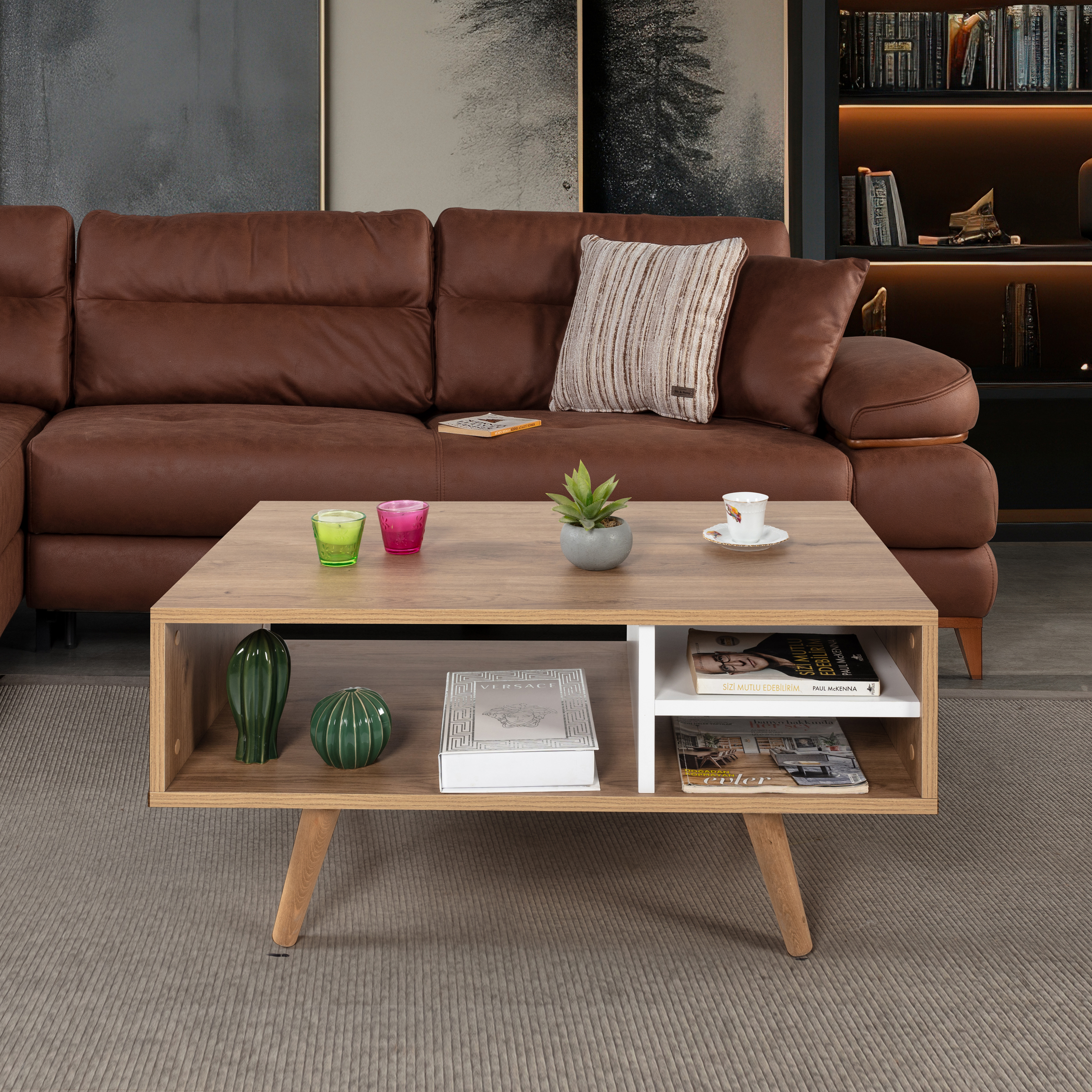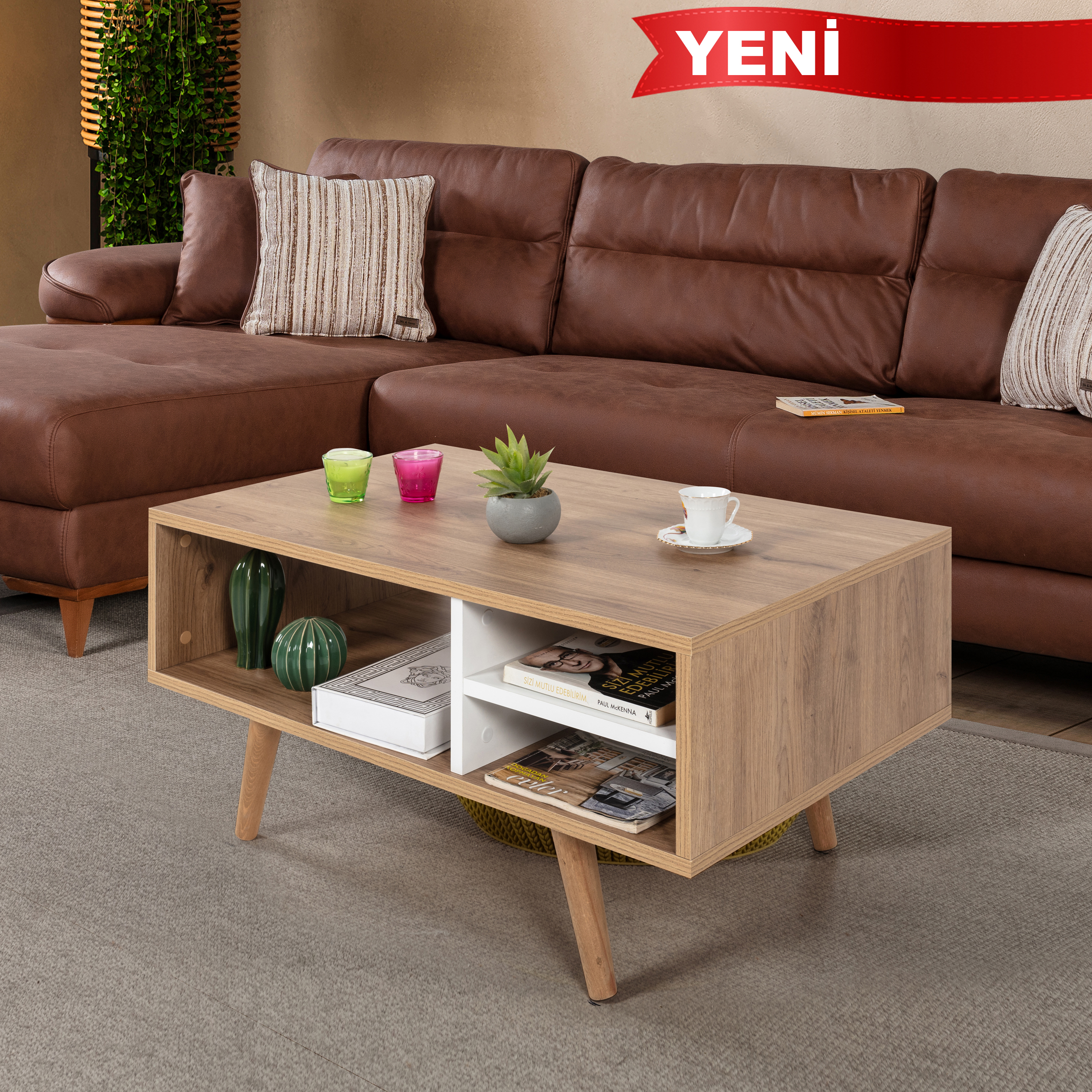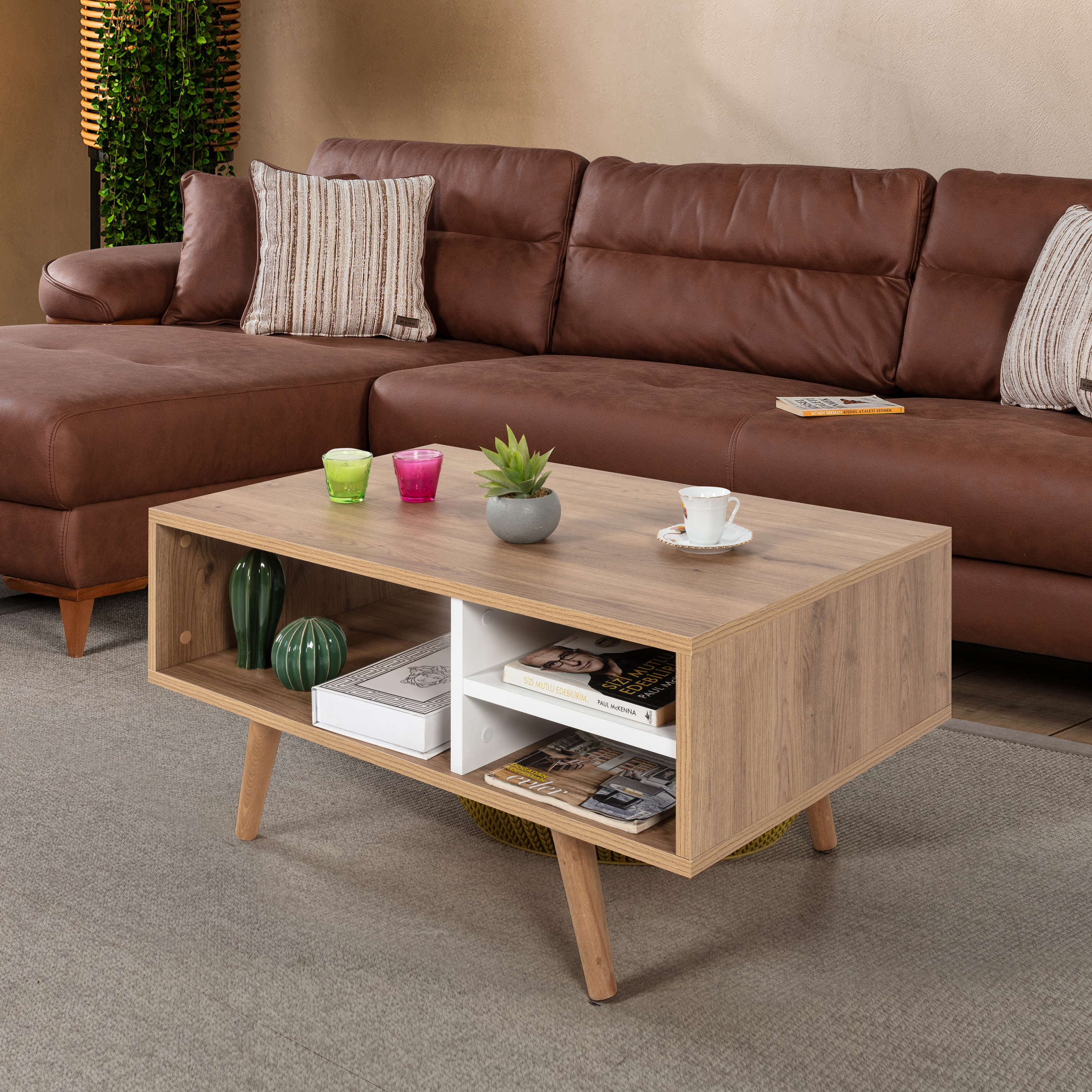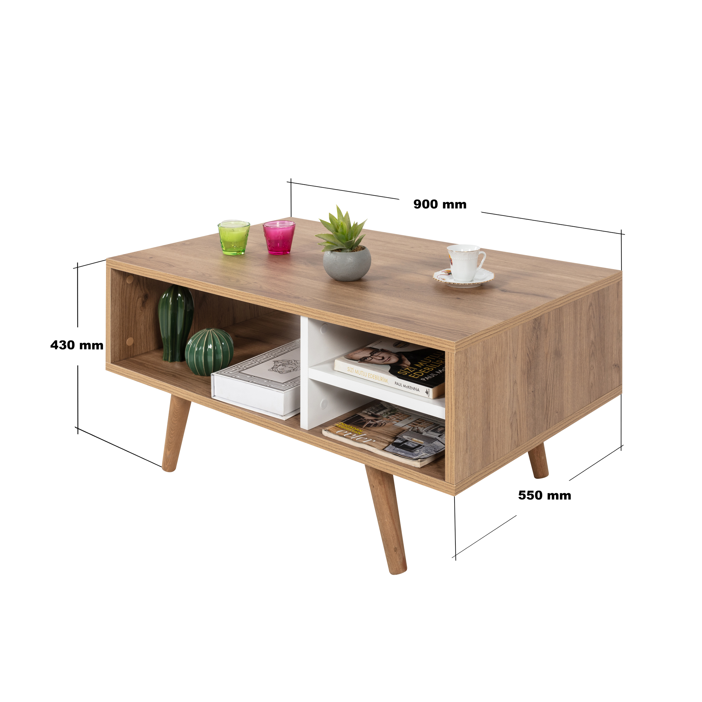 Modern Tasarımlı Ahşap Ayaklı Orta Sehpa – Şık ve Dayanıklı Evinizin en göz alıcı tamamlayıcısı olmaya aday bu modern orta sehpa, fonksiyonelliği ve estetiği bir araya getiriyor.; Ahşap ayakları sayesinde doğal ve sıcak bir görünüm sunarken, bölmeleri ve geniş raf alanı ile günlük kullanımda maksimum depolama ve düzen kolaylığı sağlar.; Ölçüler: Genişlik: 90 cm Derinlik: 55 cm Yükseklik: 43 cm Öne Çıkan Özellikler: Ahşap Ayaklı Tasarım: Doğal dokulu sağlam ahşap ayakları modern görünümü güçlendirir ve dayanıklılık sağlar.; Modern ve Şık Tasarım: Minimal çizgileriyle her dekorasyon stiline uyum sağlar.; Dayanıklı Yapı: Kaliteli malzemesi ve sağlam ahşap ayakları sayesinde uzun yıllar güvenle kullanılabilir.; Fonksiyonel Kullanım: Pratik bölmeleri ve geniş raf alanı; kitap, dergi, kumanda, dekor ürünleri gibi eşyalarınızı düzenli bir şekilde konumlandırmanızı sağlar.; Çok Yönlü Kullanım: Salon, oturma odası veya ofis ortamlarında estetik ve işlevsel bir tamamlayıcı mobilya olarak ideal.; Modern yaşam alanlarına hem stil hem de düzen katacak bu orta sehpa, kullanım kolaylığı ve dekoratif görünümüyle vazgeçilmez parçanız olacak.; Uluslararası Standartlarda Paketleme: Hasarsız ve sorunsuz bir teslimat süreci için ürünlerimiz en doğru yöntemlerle paketlenerek sizlere teslim edilmektedir.; Fabrikamızda demonte olarak hazırlanan ürünlerimizin paketlenmesinde, ürünleri korumak için yan yüzeylerde 18 mm kalınlıkta kesilen, Petek Panel adı verilen karton malzeme kullanılmaktadır.; Ürün köşelerinin deforme olmasını engellemek amacıyla, 2 cm kalınlığında köpük ve 4mm kalınlığında mukavva köşe koruyucu kullanılarak paketleme yapılmaktadır.; Dış koli ambalajında ise 5 katmanlı oluklu mukavva kullanılmaktadır.; Böylece en hassas ürünler bile güvenli şekilde taşınabilmektedir.; Tüm kartonlar %100 geri dönüşüm özelliğine sahiptir.; Kurulum Bilgisi: Ürünlerimiz demonte olarak gönderilmektedir ve kurulum müşteriye aittir.; Paketin içerisinden çıkan kurulum şablonu ile ürününüzü keyifle kullanıma hazırlayabilirsiniz.; Daha kolay bir kurulum için tüm parçalar üzerinde bulunan numaralar sayesinde, bağlantı aksesuarlarının yerini kolayca bulabilirsiniz.; Ürünün kurulumu için tornavida ve çekiç yeterlidir.; Bağlantı sistemi olarak minifiks, kavela tercih edilmektedir.; Böylece ürün zarar görmeden, defalarca kolaylıkla sökülüp kurulabilir.; 1. Sınıf Hammadde İle Üretim: Ürünlerimiz Suntalam olarak bilinen, sağlığa zararsız, kanserojen madde içermeyen Avrupa E1 kalite standartlarında yonga levhalardan üretilmiştir.; Üretimde kullanılan tüm malzemeler çevre ve çocuk sağlığı standartlarına uygundur.; Ürünlerimiz kendi fabrikamızda, yüksek teknolojili makine parkurlarında tüm aşamaları özenle kontrolden geçerek sizlere ulaşmaktadır.; Üretimin tüm aşamalarının dijital ortamda gerçekleşmesi sayesinde hata minimum düzeydedir.; Garanti: Tüm ürünlerimiz üretim ve işçilik hatalarına karşı, ürünün tüm parçaları dahil olmak üzere fatura tarihinden itibaren 2 yıl garantilidir.;
