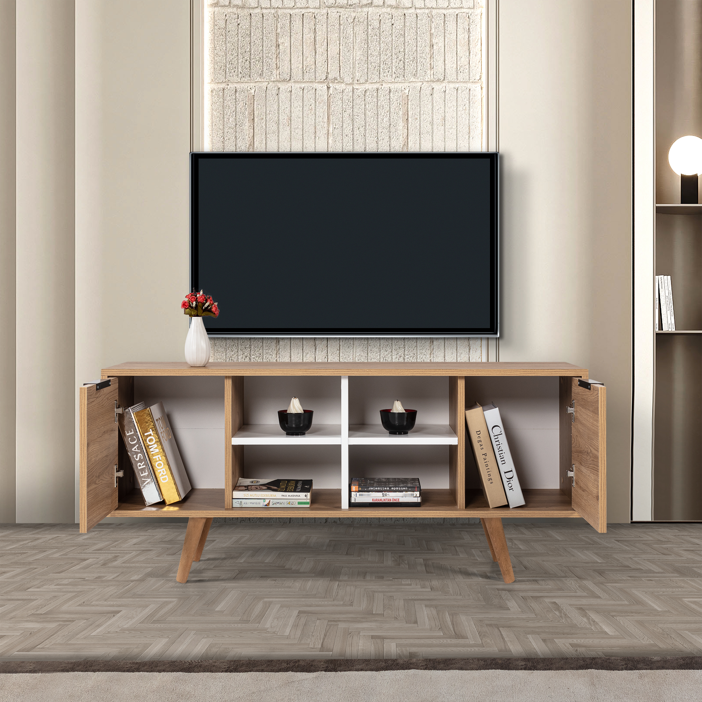 Doğal ahşap tonlarındaki sağlam ayaklar, ünitenize sıcak bir görünüm kazandırırken; şık metal kulplar, modern tasarımı tamamlayarak ürüne zarif bir kontrast katar. Hem dayanıklı hem de göz alıcı bu detaylar, üniteye karakter kazandırır.